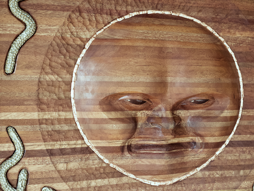 Our concept is based around our friendship. It has come full circle into a story about the moon and the sea. Through the Indigenous lens they are old friends - like us - that weave in and out of each other's lives. They are not always present with each other - but they always return with a draw and a pull like the moon brings the cyclical tide. The vibrant tidal zone is a reminder of the bounty they bring to each others lives - so much richer for its dynamic and sometimes turbulent nature. Something so great about the mahogany that we are celebrating in this piece is its strength and durability. What used to be destined to become a boat for navigating the waters, has since become deadstock. The tide has pulled it in and honored it with purpose once again. Becoming a vessel representative of human spirit, friendship and the land that brings us together.